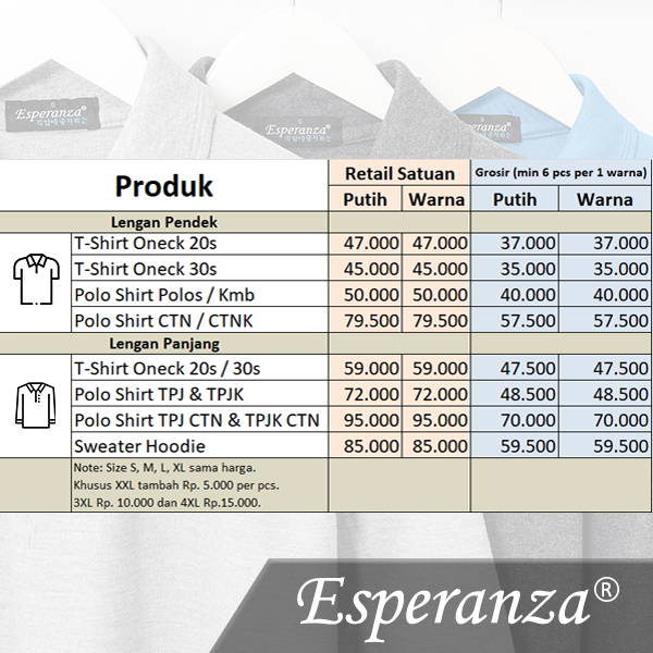 Panduan standard berat kaos polos dan polo shirt polos Esperanza kami: